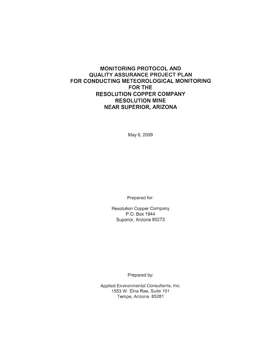 This document presents the monitoring and quality assurance project plan for a meteorological monitoring program to be implemented for Resolution Copper Company for a copper mine in Pinal County Arizona. The objectives of the monitoring program are to provide the measurements necessary to establish meteorological conditions that affect the transport and dispersion of emissions from potential sources at the future Resolution facility.