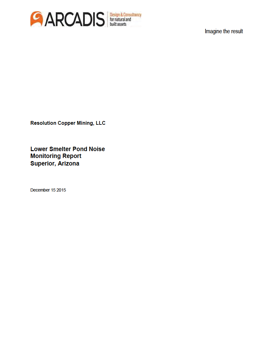 ARCADIS U.S. Inc. 2015a. Lower Smelter Pond Noise Monitoring Report: Resolution Copper Mining, Superior, Arizona. Phoenix, Arizona: ARCADIS Design and Consultancy. December 15.