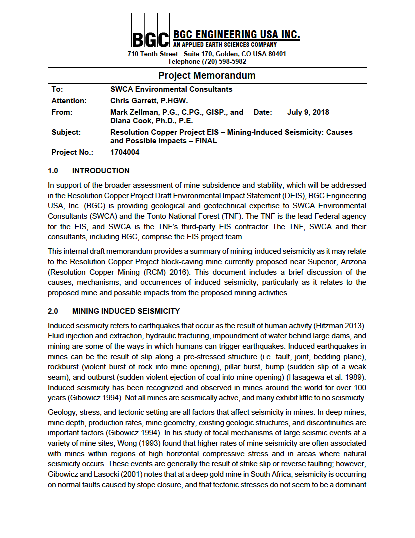 BGC Engineering USA Inc. 2018b. Resolution Copper Project EIS - Mining-Induced Seismicity: Causes and Possible Impacts. Project No.: 1704004. Memorandum. Golden, Colorado: BGC Engineering USA Inc. July 9.