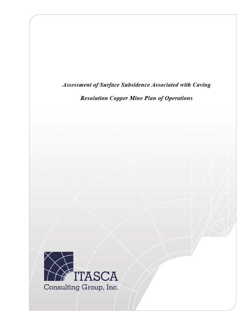 This report summarizes the results of geomechanical studies of cave growth and subsidence potential performed by Itasca Consulting Group, Inc. (Itasca) for Resolution Copper Mining, LLC (Resolution Copper).