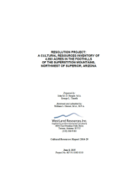 Hooper, J.M.D., and G.L. Tinseth. 2015. Resolution Project: A Cultural Resources Inventory of 4,890 Acres in the Foothills of the Supersition Mountains, Northwest of Superior, Arizona. Cultural Resources Report 2014-29. Project No. 807.91 0500 0550. Tucson, Arizona: WestLand Resources, Inc. June 8.