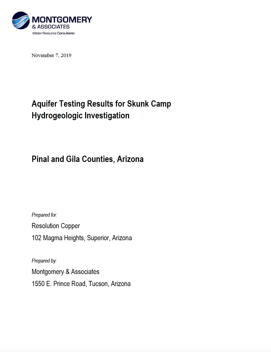 Montgomery and Associates Inc. 2019a. Aquifer Testing Results for Skunk Camp Hydrogeological Investiation, Pinal and Gila Counties, Arizona. Prepared for Resolution Copper. Tucson, Arizona: Montgomery and Associates. November 7.