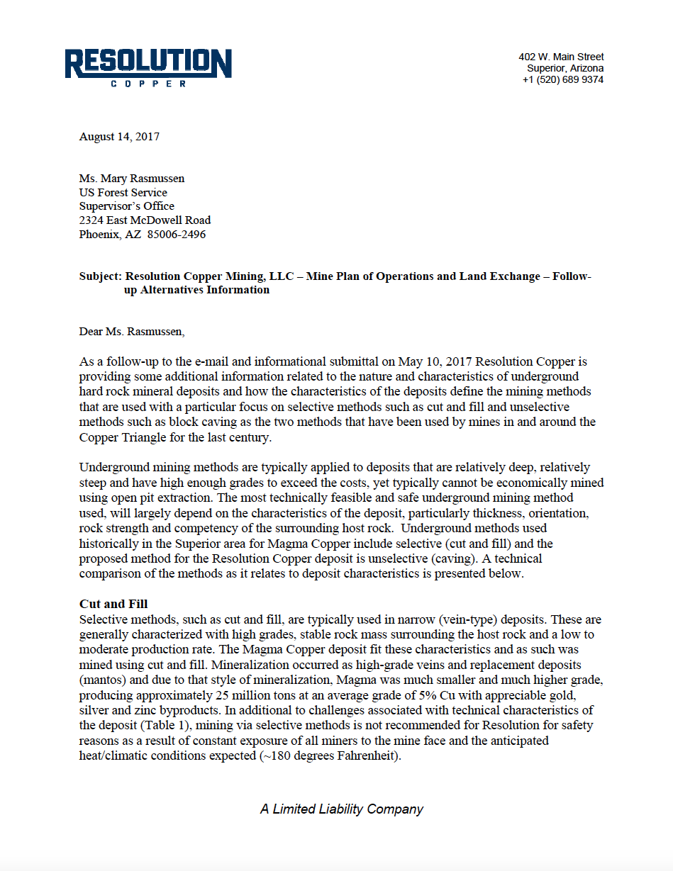 Resolution Copper. 2017a. Follow-up Alternatives Information. Letter from Victoria Peacey, Senior Manager, Permitting and Approvals, Resolution Copper to Mary Rasmussen, U.S. Forest Server. Superior, Arizona: Resolution Copper. August 14.