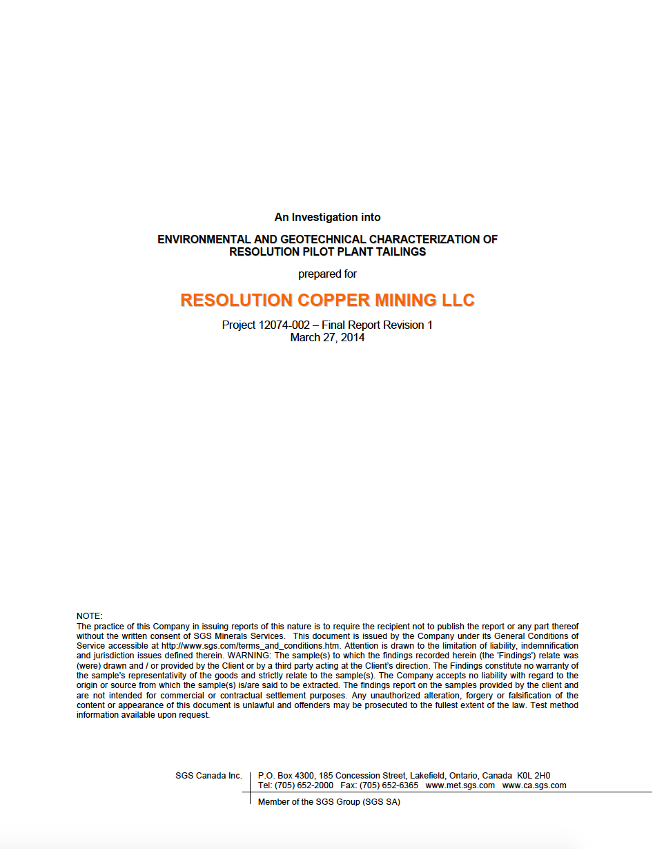 SGS Mineral Services. 2014. Environmental and Geotechnical Characterization of Resolution Pilot Plant Tailings, Report to Resolution Copper Mining, Project 12074-002 – Final Report Revision 1, March 27, 2014.