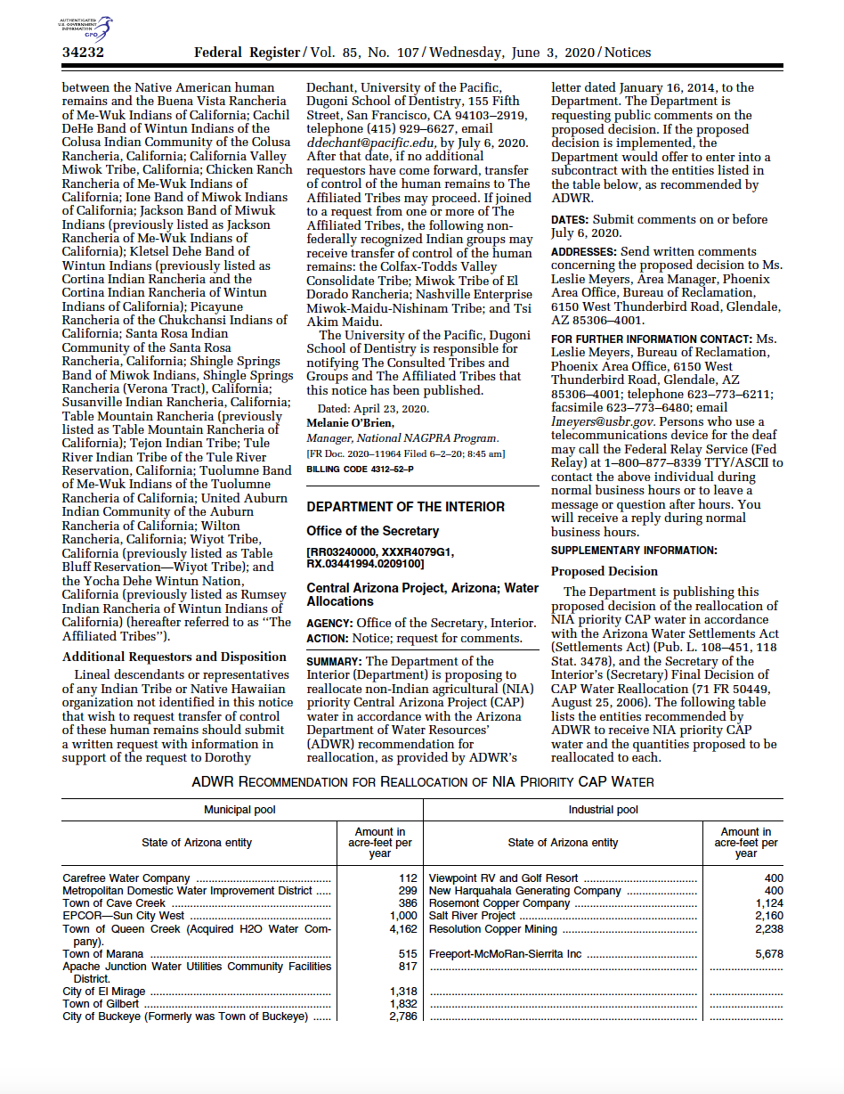 U.S. Department of the Interior. 2020. Central Arizona Project, Arizona; Water allocations. Federal Register 85(104):34232-34234.