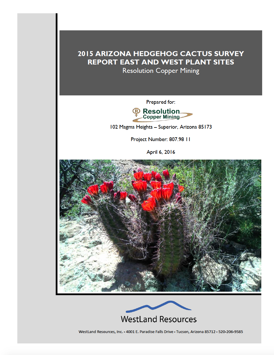 WestLand Resources Inc. 2015a. 2015 Arizona Hedgehog Cactus Survey Report East and West Plant Sites. Resolution Copper Mining.