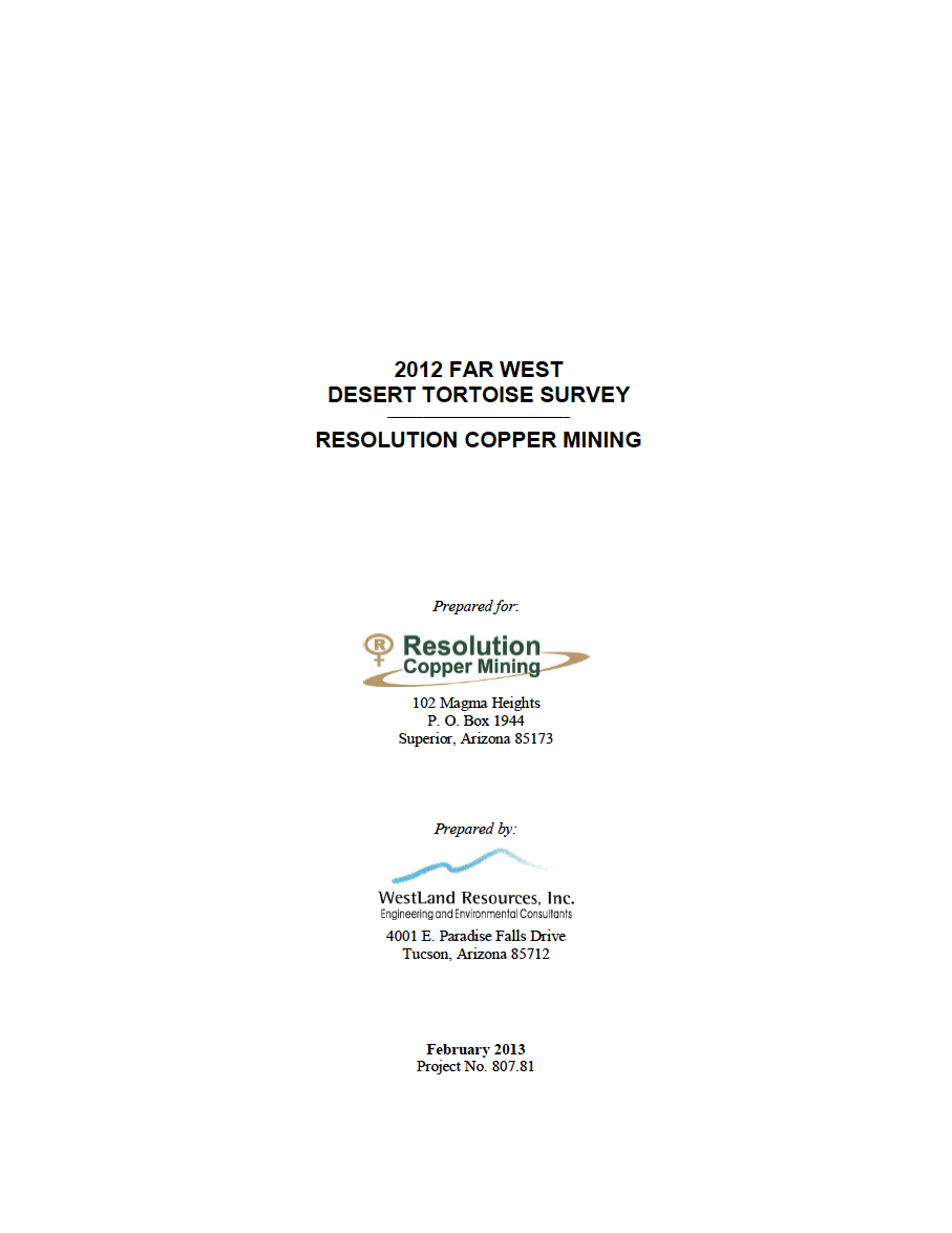Surveys were conducted for Morafka's desert tortoise (Gopherus morafkai, formerly G. agassizii, Sonoran population) within the Far West property located near Florence Junction, Arizona. The purpose of this study was to provide information on the occurrence and distribution of the tortoise within the study area.